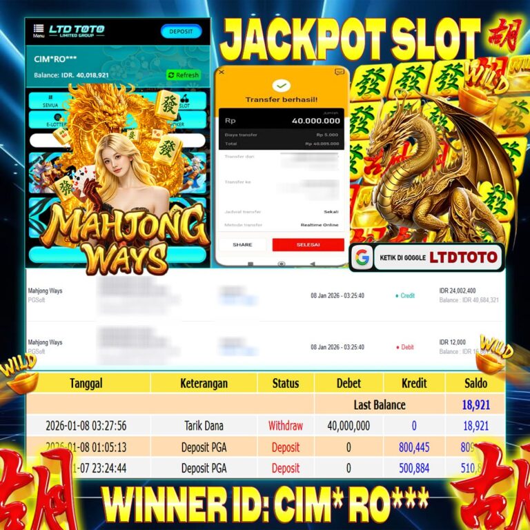 LTDTOTO JACKPOT MAHJONG WAYS RP 40.000.000 KAMIS 08 JANUARI 2025 Selamat kepada User id : CIM*RO*** Telah berhasil mendapatkan kemenangan besar pada permainan SLOT MAHJONG WAYS, kemenangan Sebesar Rp.40.000.000 , Setelah mengisi formulir withdraw dengan kurang waktu hanya 5 – 10 menit pihak LTDTOTO sudah melakukan transfer kepada pemilik User id dan dana sudah dapat di cairkan oleh pemenang. Bukti pembayaran…