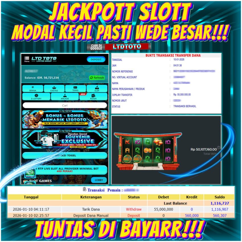 Selamat kepada User id : AD***42 Telah berhasil mendapatkan kemenangan besar pada permainan SLOT DRAGON KING HOT POTS, kemenangan Sebesar Rp.55.000.000 , Setelah mengisi formulir withdraw dengan kurang waktu hanya 5 – 10 menit pihak LTDTOTO sudah melakukan transfer kepada pemilik User id dan dana sudah dapat di cairkan oleh pemenang. Bukti pembayaran yang kami berikan merupakan bukti pembayaran yang SAH / VALID yang langung di dapatkan melaui tanda transfer transaksi dari Bank yang di tuju. Kami mengucapakan banyak Terima Kasih Kepada pemenang karena sudah mempercayakan kami sebagai Bandar Tepercaya yang membayar semua kemenangan member hingga lunas. Masih ragu dengan LTDTOTO bos ? Di mana bandar togel online sekarang yang terpercaya seperti LTDTOTO? Bandar yang mengirimkan kemenangan member tanpa bertele – tele. Jadi…. tidak perlu khwatir pada situs LTDTOTO karena kemenangan anda berapapun akan dibayarakan hingga lunas kepada pemenang.